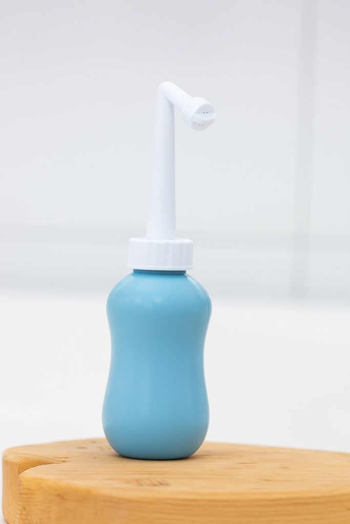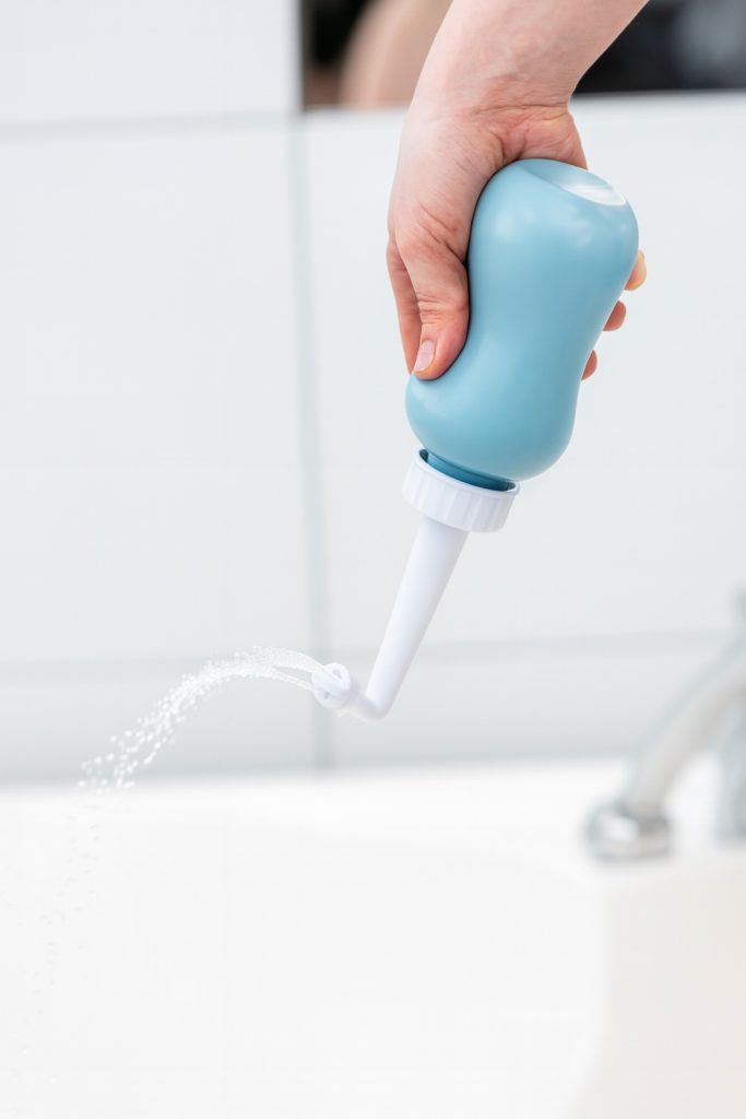 etter at du er ferdig på toalettet trekker du ut tuten på flasken og holder den opp ned i toalettet. Hvis du skal skylle endetarmsåpningen er det best å holde flasken bak deg. Skal du skylle urinrørsåpningen holder du flasken mellom bena foran deg.
